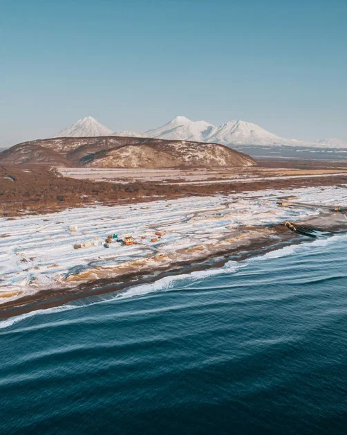 После «спуска на землю» отправляемся на реальный край земли – Халактырский пляж (~50 км). Там холодные воды Тихого океана накатывают на чёрный песчаный пляж, а самые смелые смогут прогуляться босиком в прибойной волне.